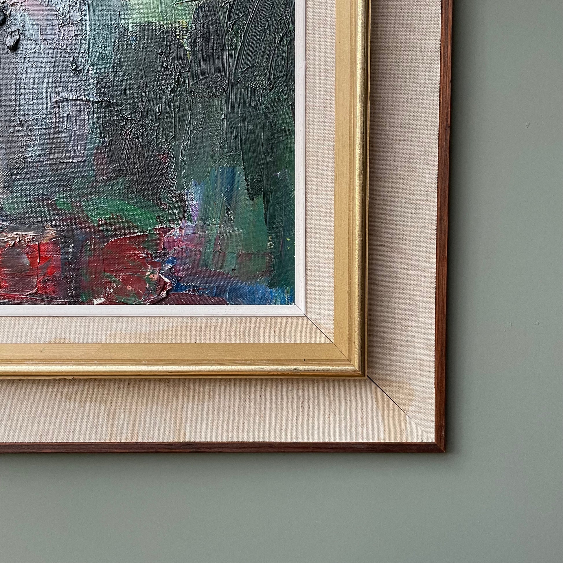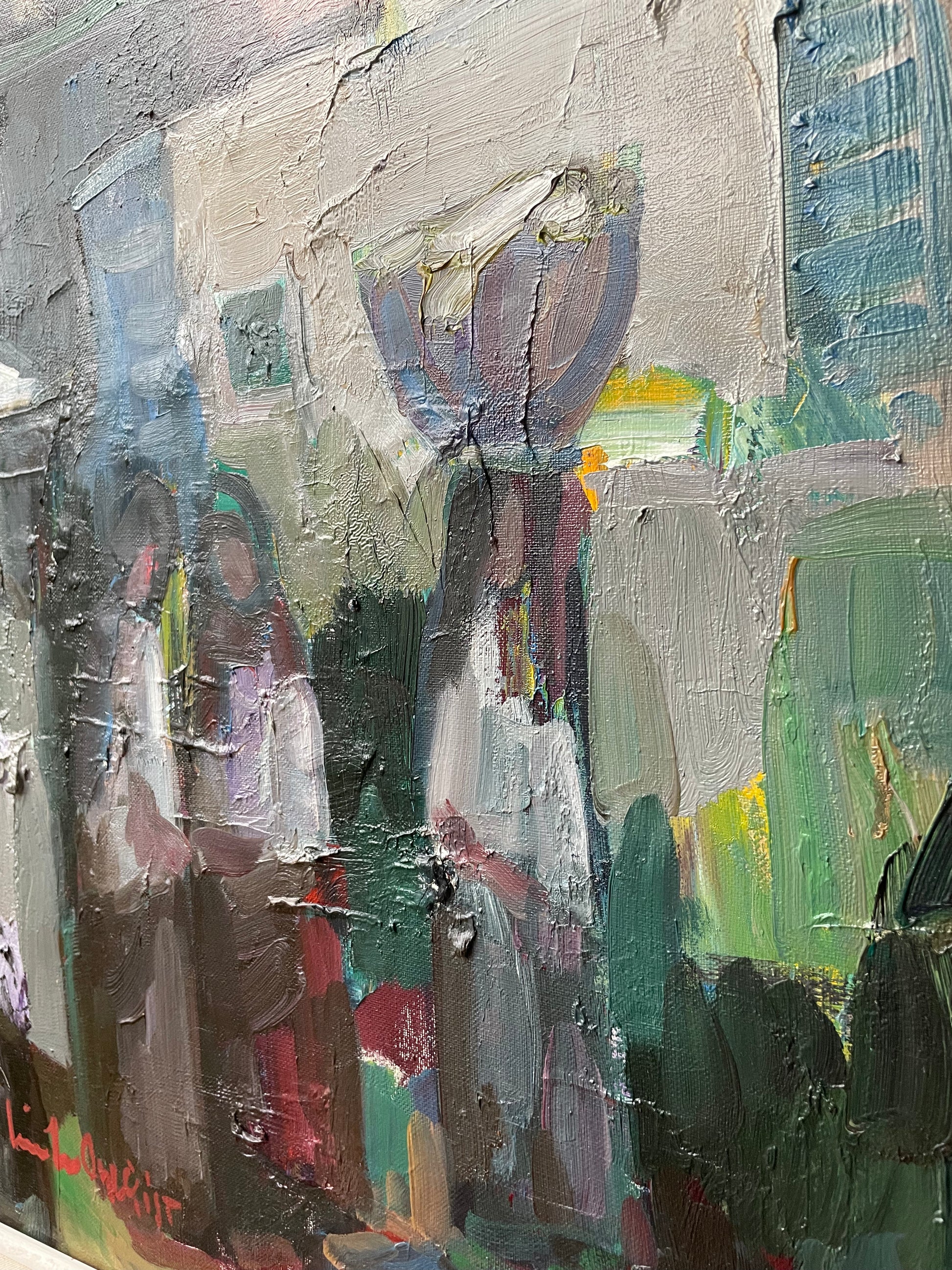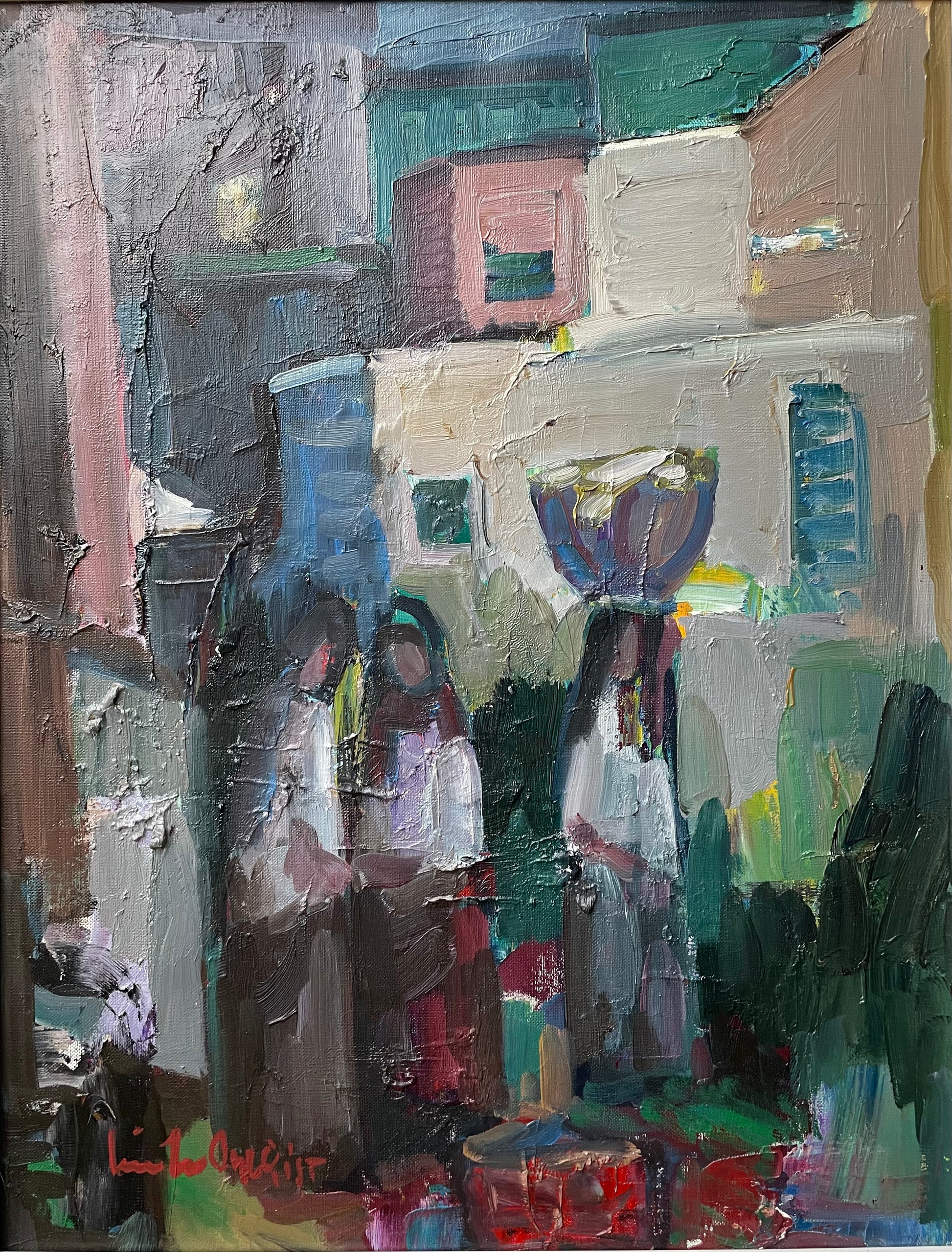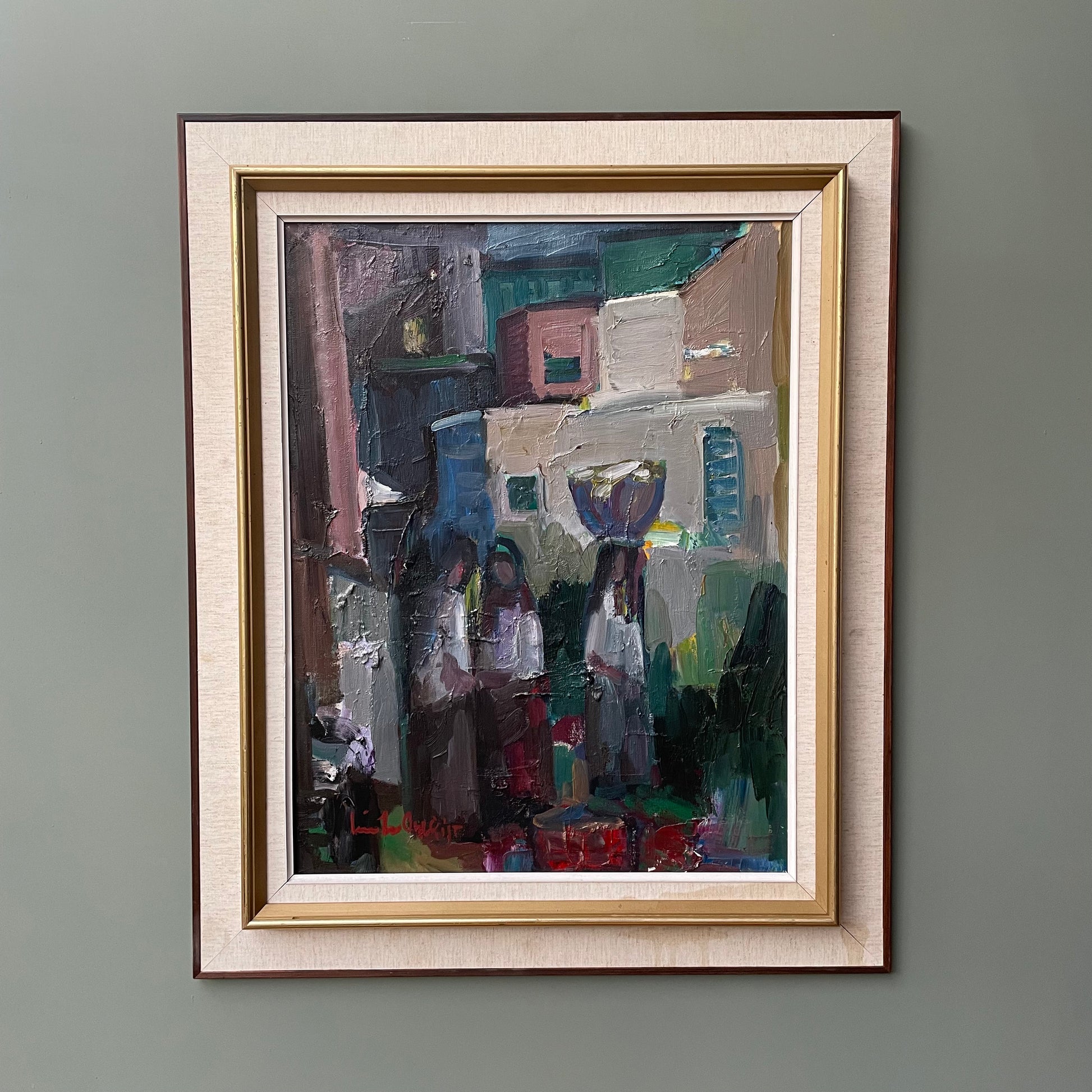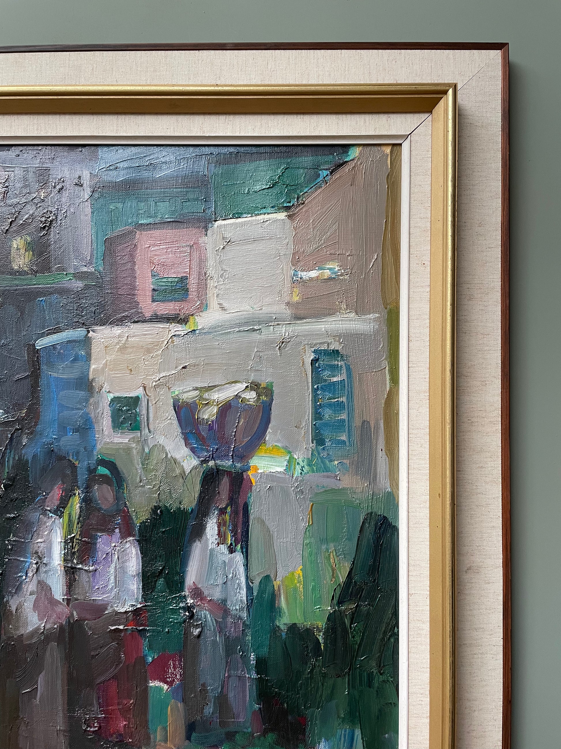 This large textured oil on canvas is stunning with its abstract depiction of three woman in a village or town. The palette is rich and would add warmth to any room.