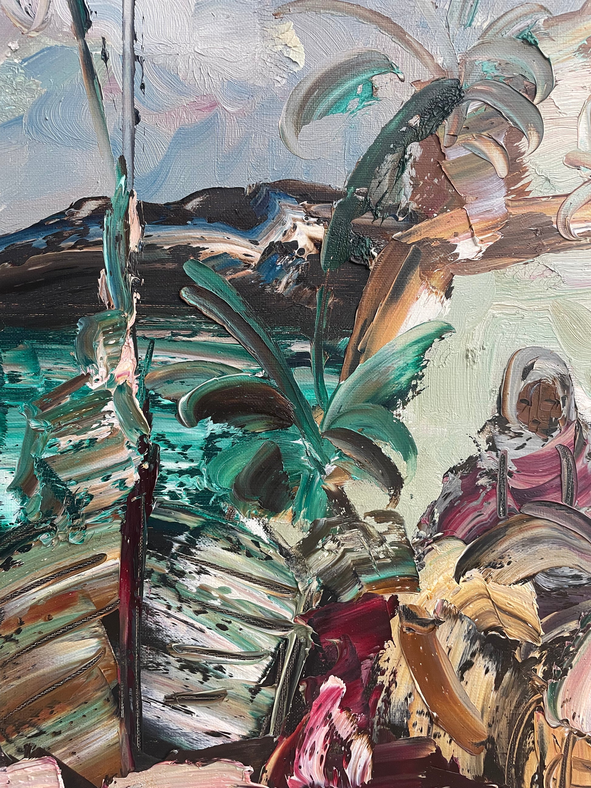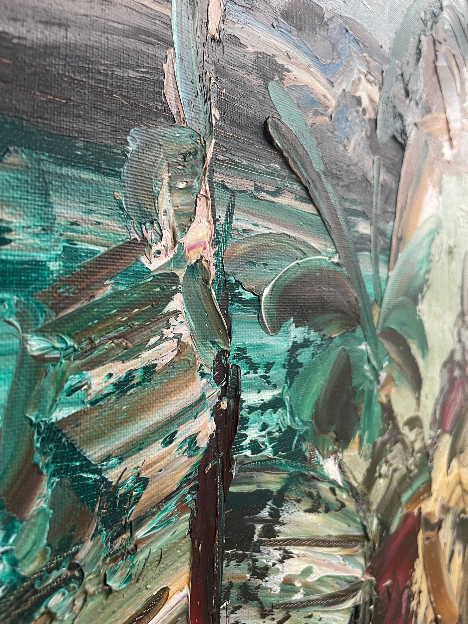 This large oil on canvas is stunning with its abstract depiction of a woman in a town harbour. The palette of greens and pinks is both warm and vibrant. The artist has created texture and depth with their broad brushstrokes. We know this would look stunning on any wall.