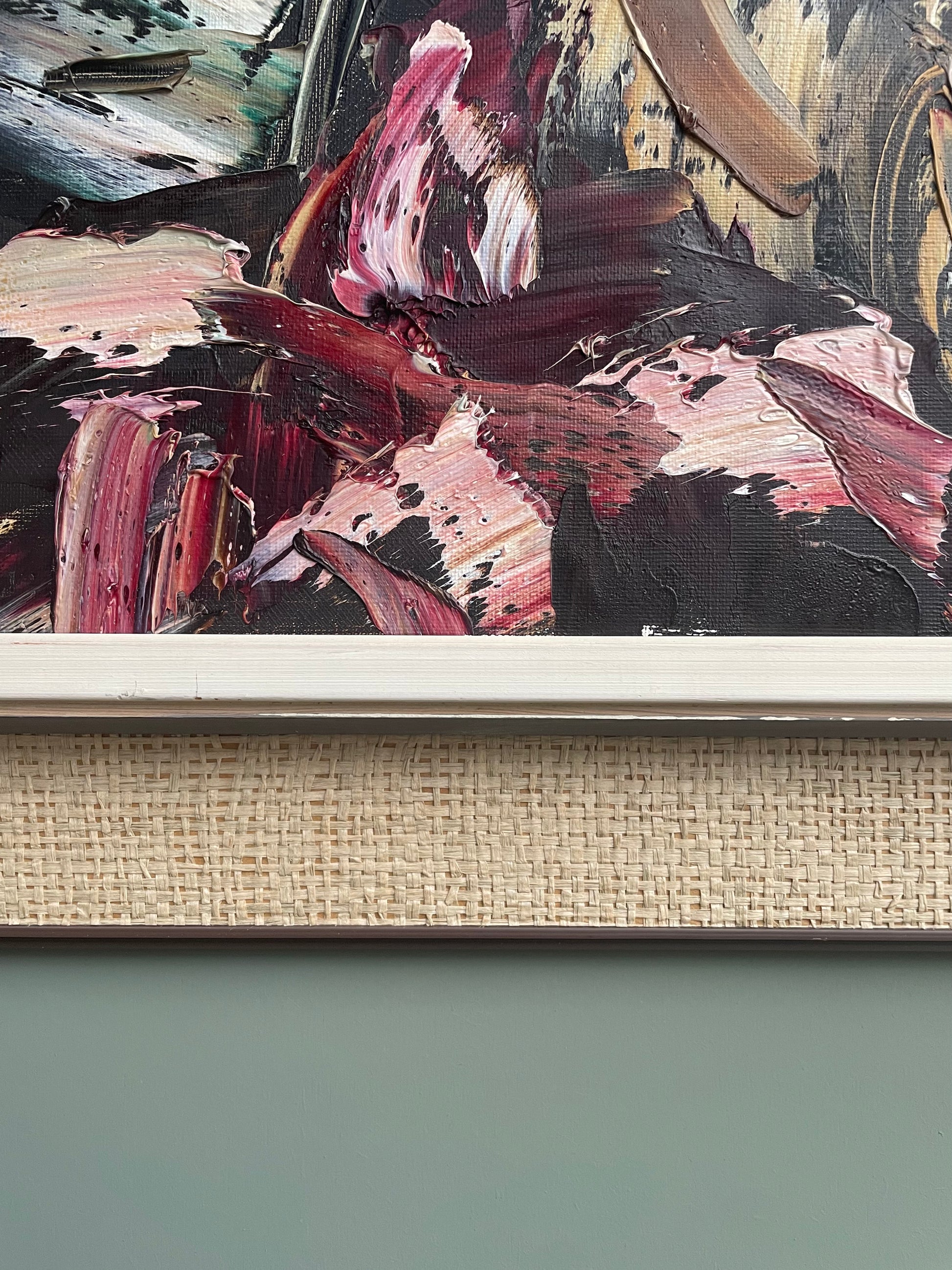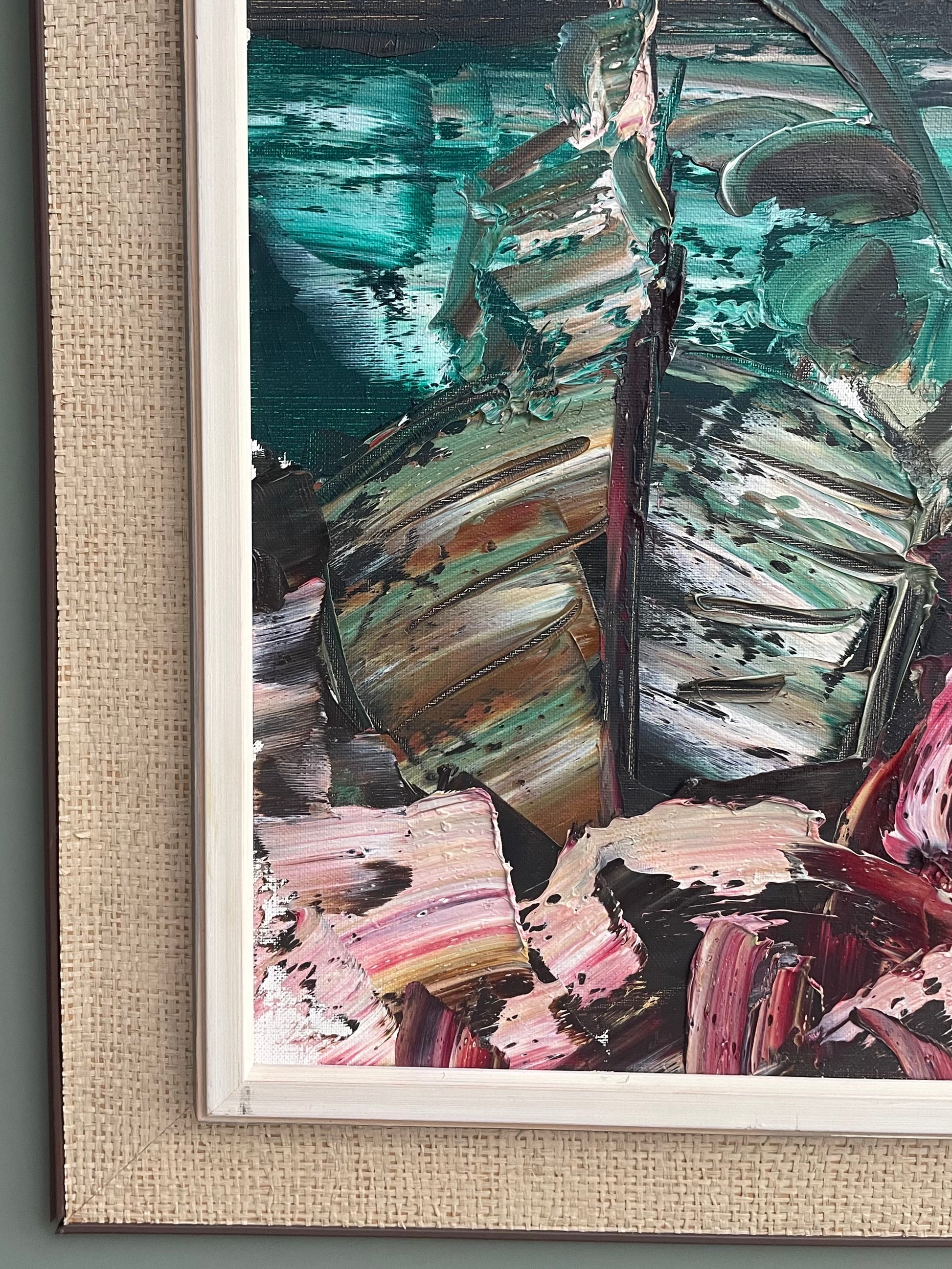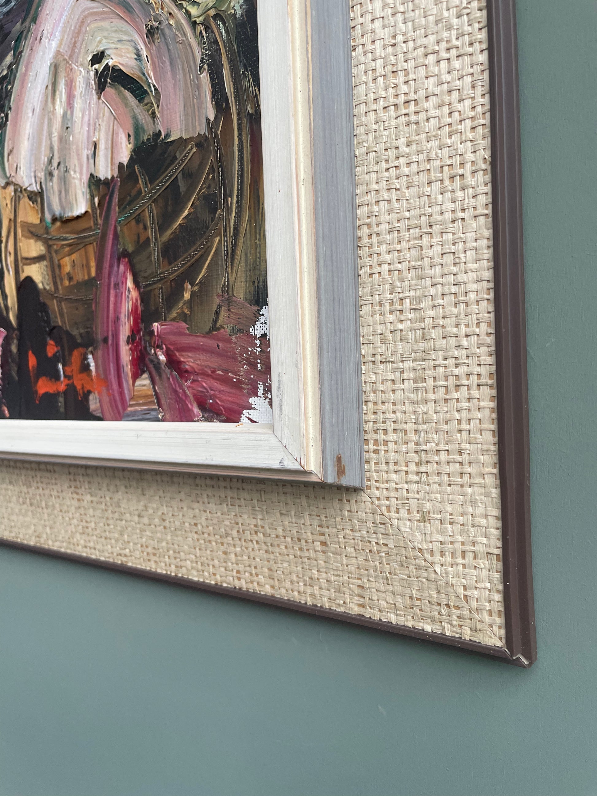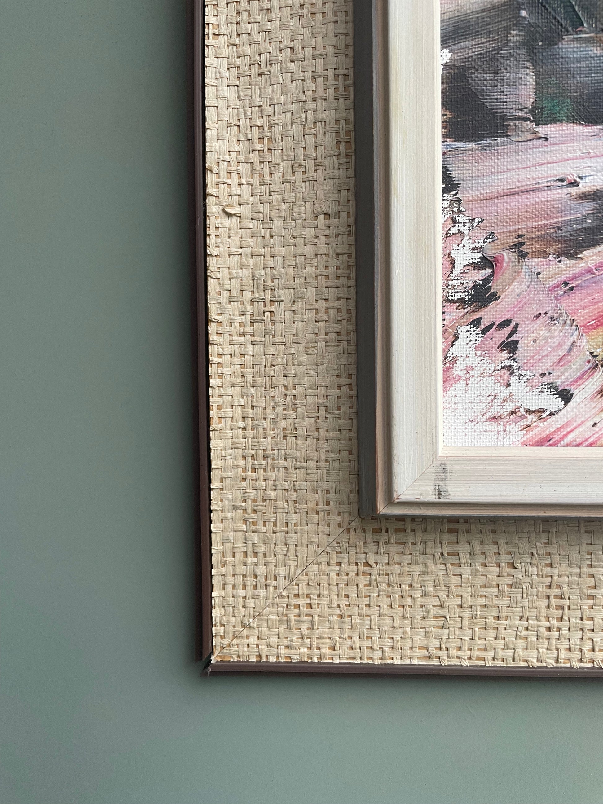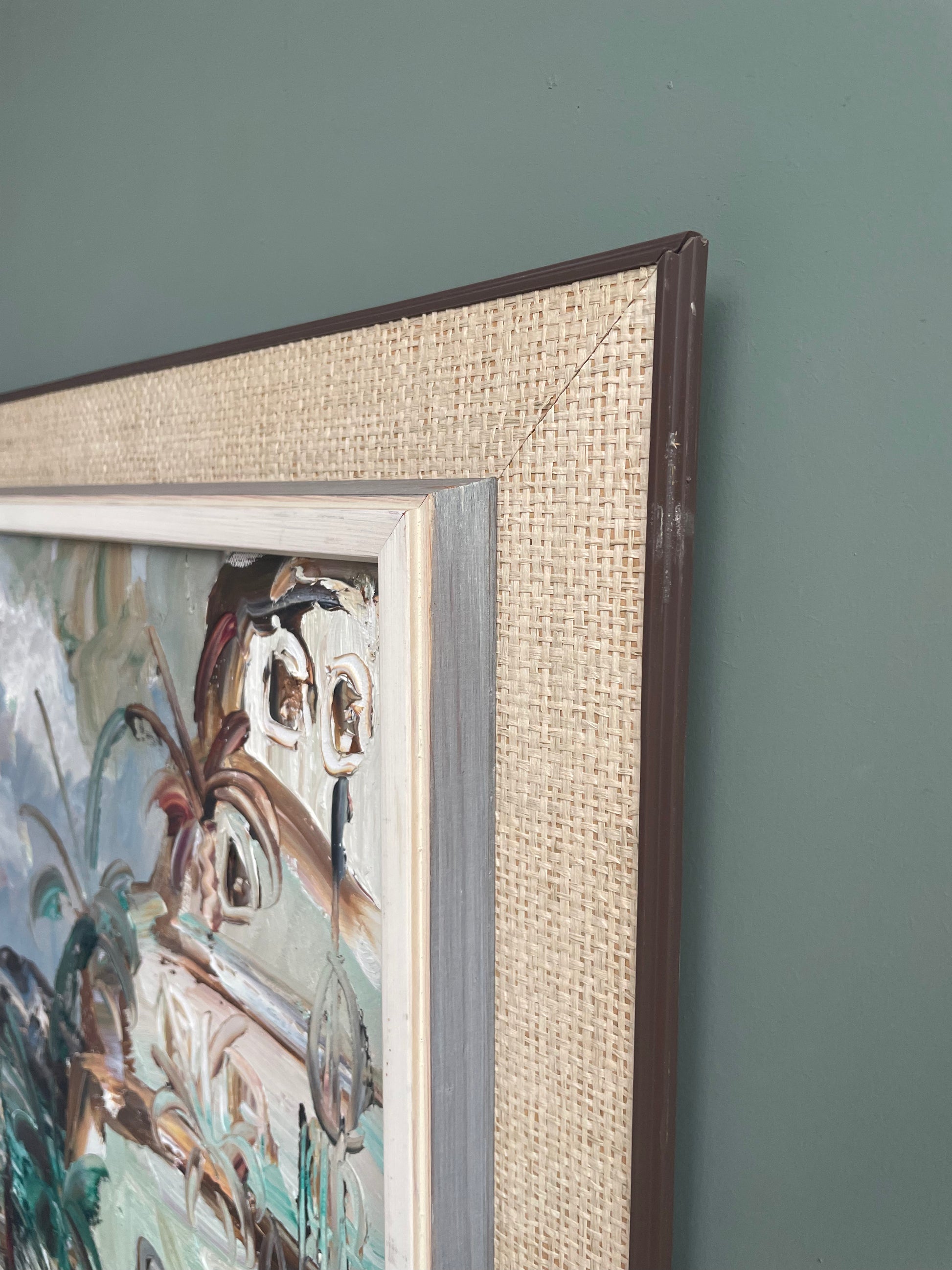 Condition: This painting is in great vintage condition. The rattan and wood frame has a few areas of wear and tear, and paint loss, along with the widening of a the bottom left corner join.