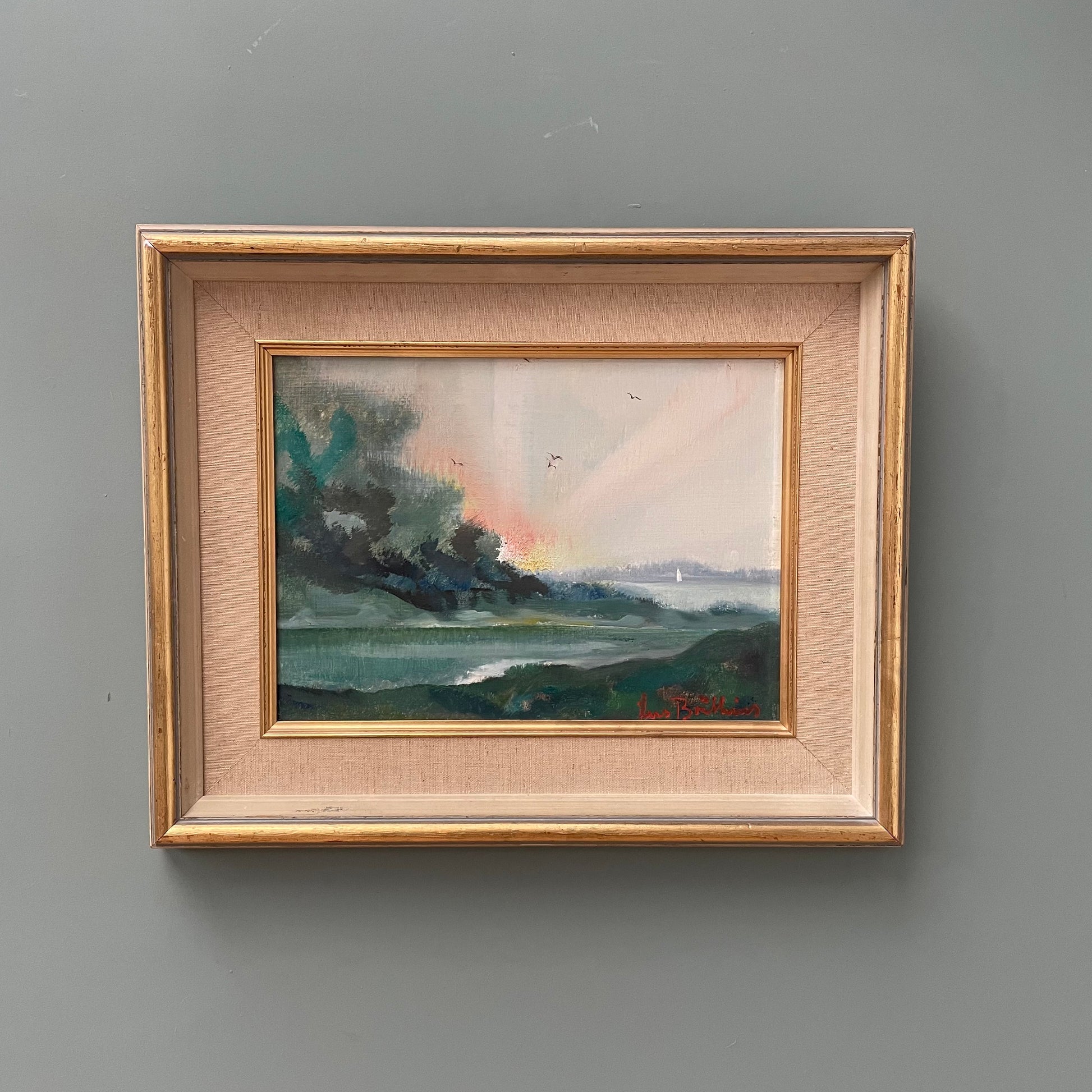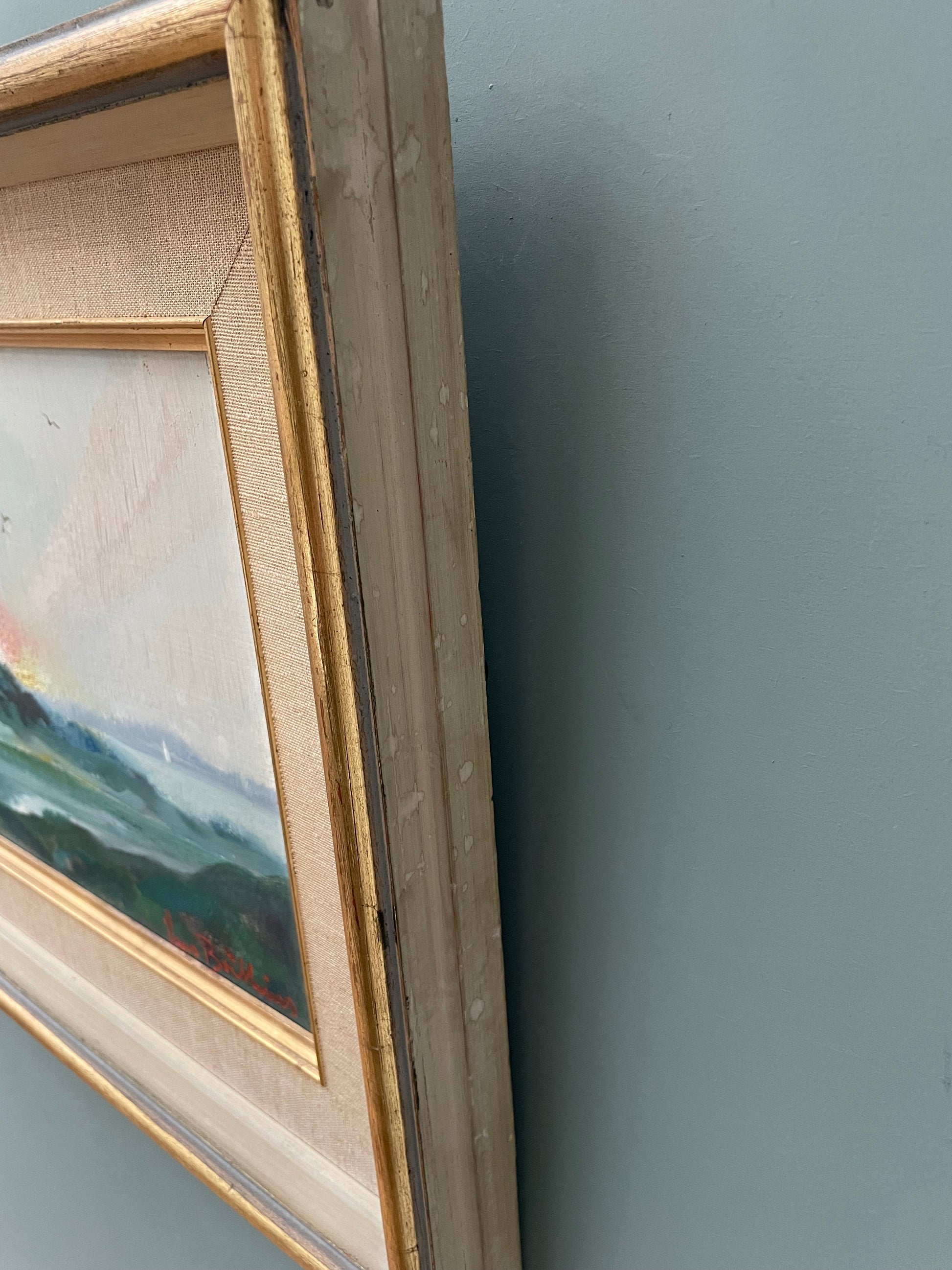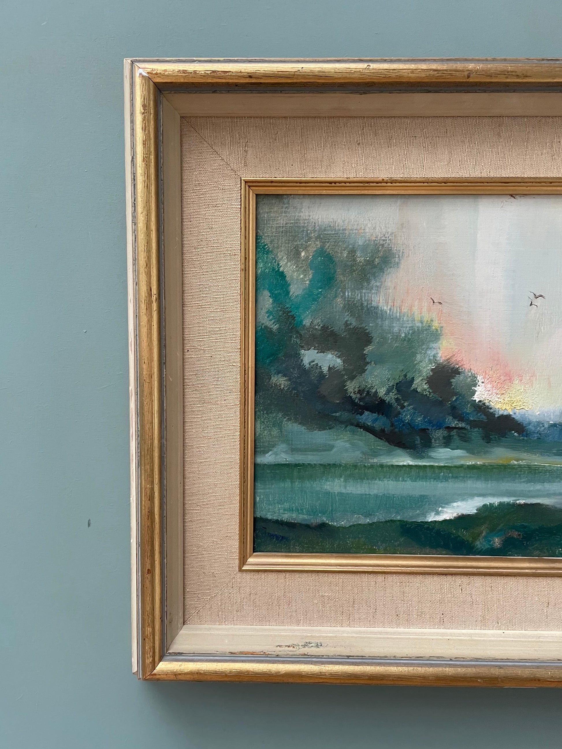 A stunning mid-century oil on board. The use of pinks and teals creates a wonderfully calming piece and the canvas and gold frame really compliments the painting