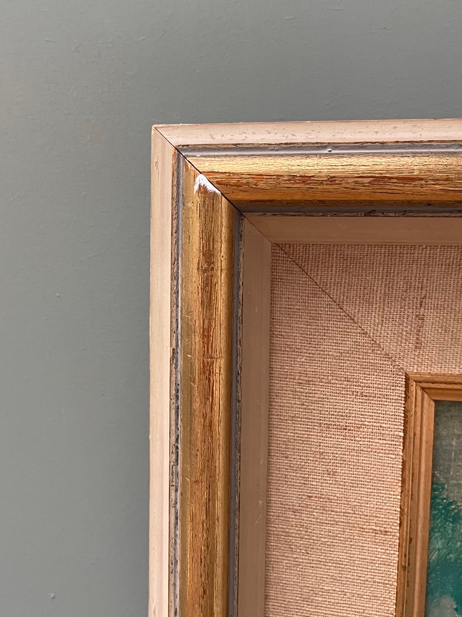 Condition: This painting is in great vintage condition. The gold painted frame has a few areas of paint loss/chips, examples shown.