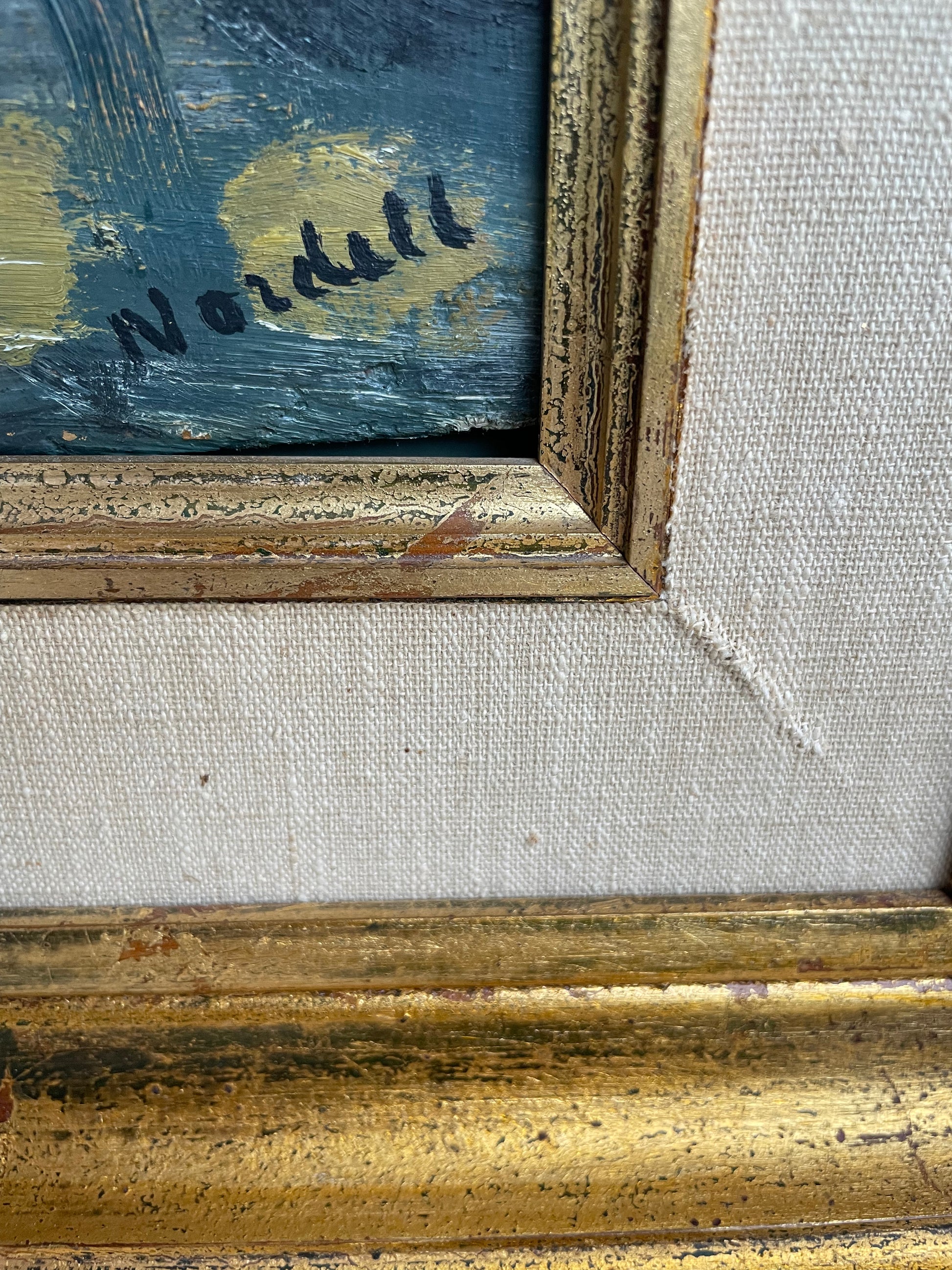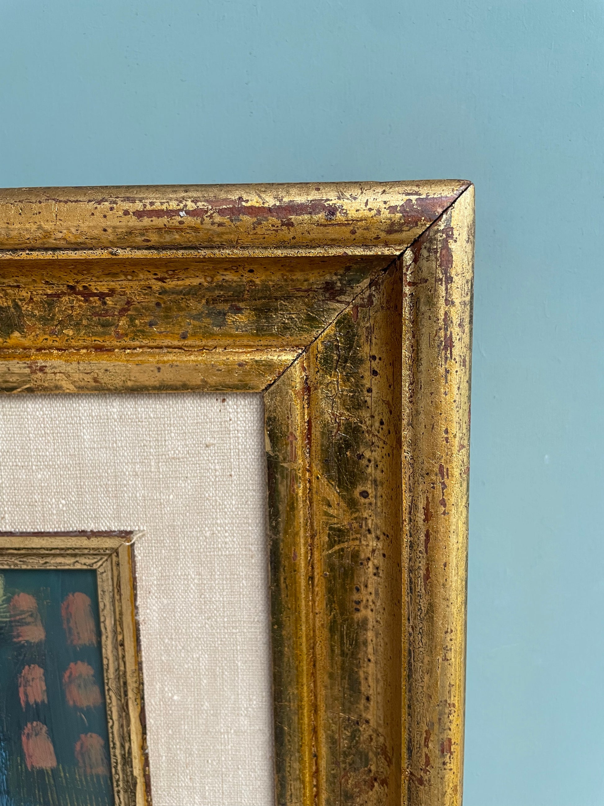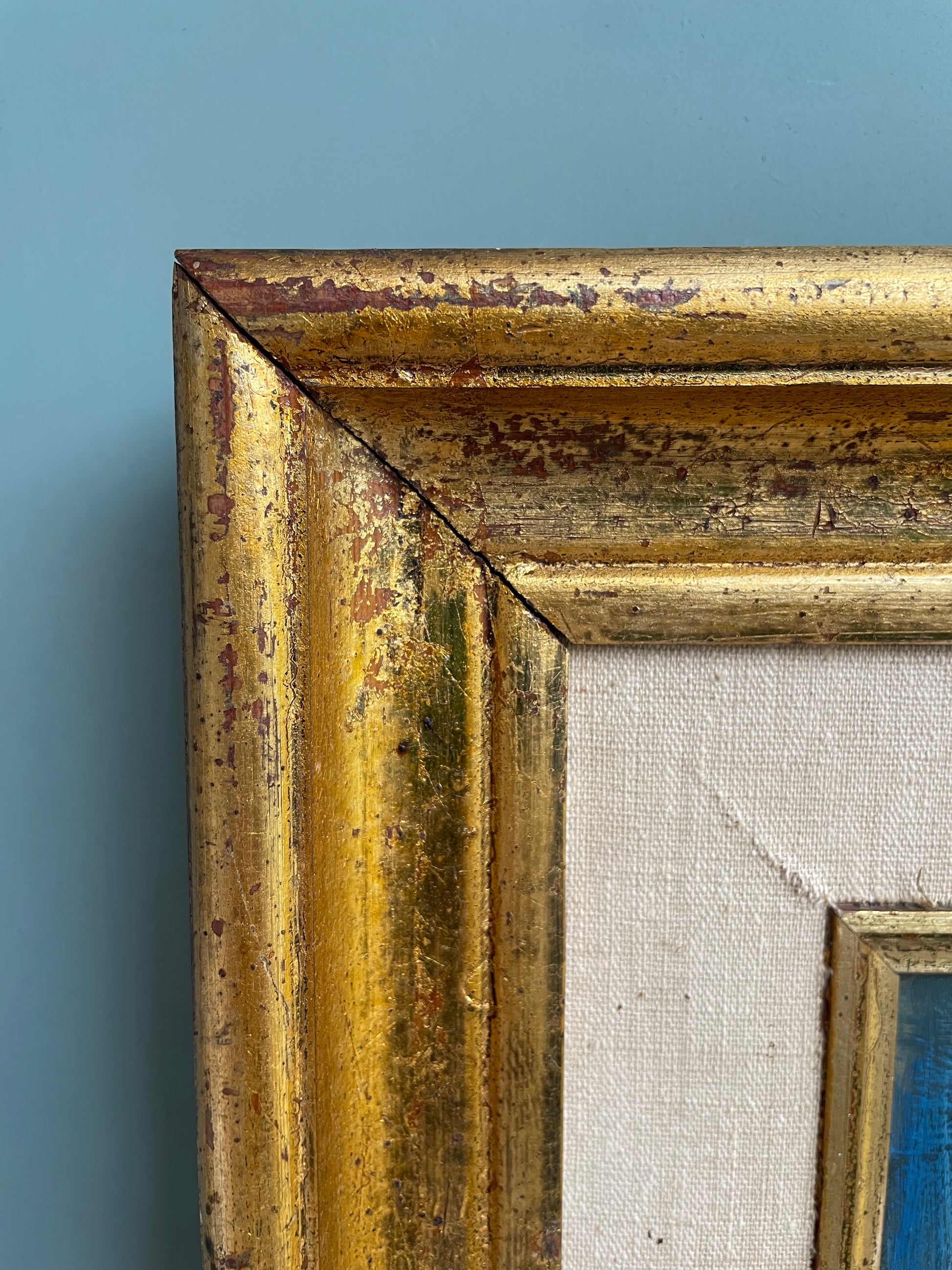 Condition: This painting is in great vintage condition, with only minor wear and tear on the canvas and wooden frame. The board does not quite fill the frame on the bottom right hand-side of the painting but is only noticeable upon closer inspection