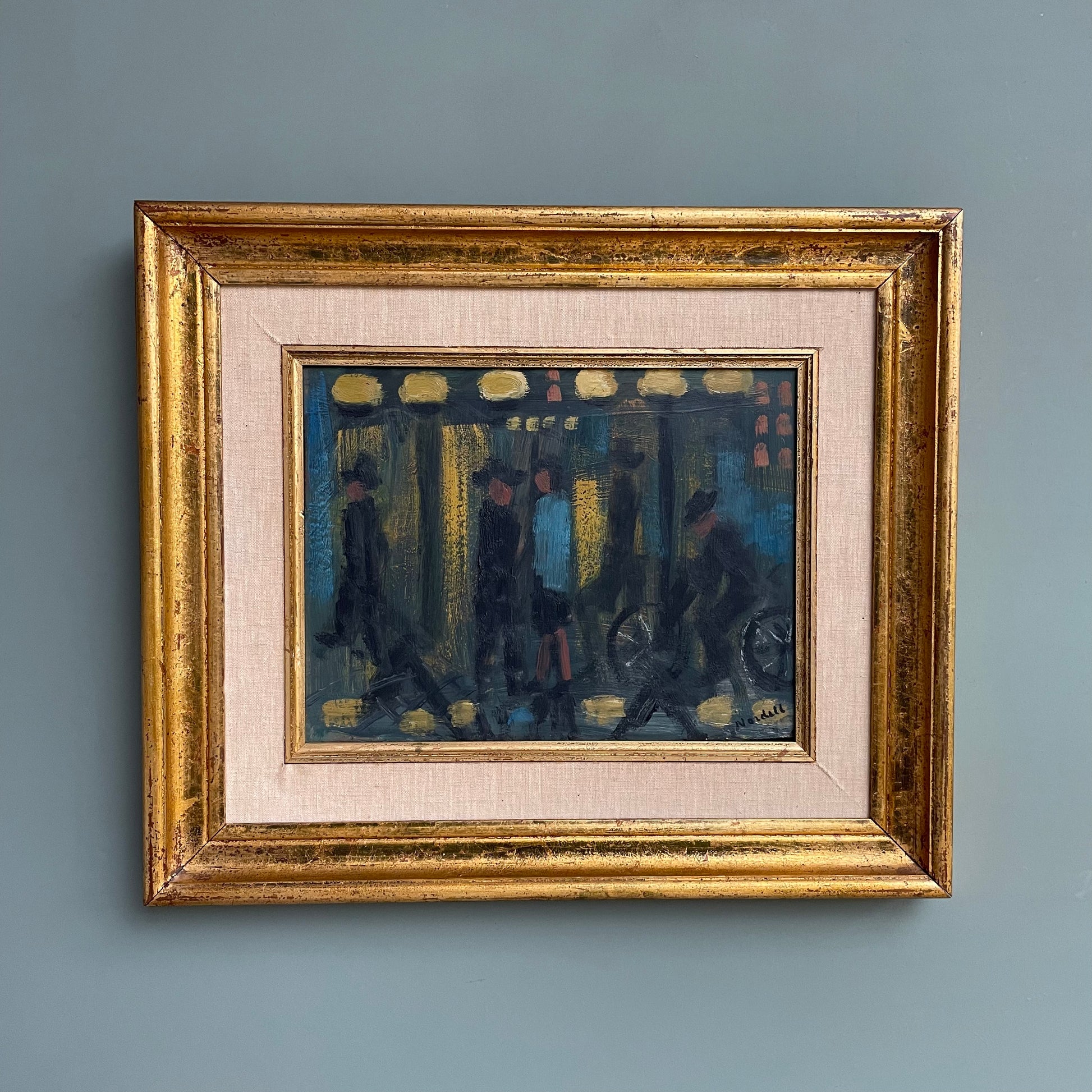 A dark and atmospheric oil on board depicting people bathed in streetlight. The mix of blacks, blues and yellows creates a beautiful composition and the hand-painted gold and canvas frame sets really this piece off.