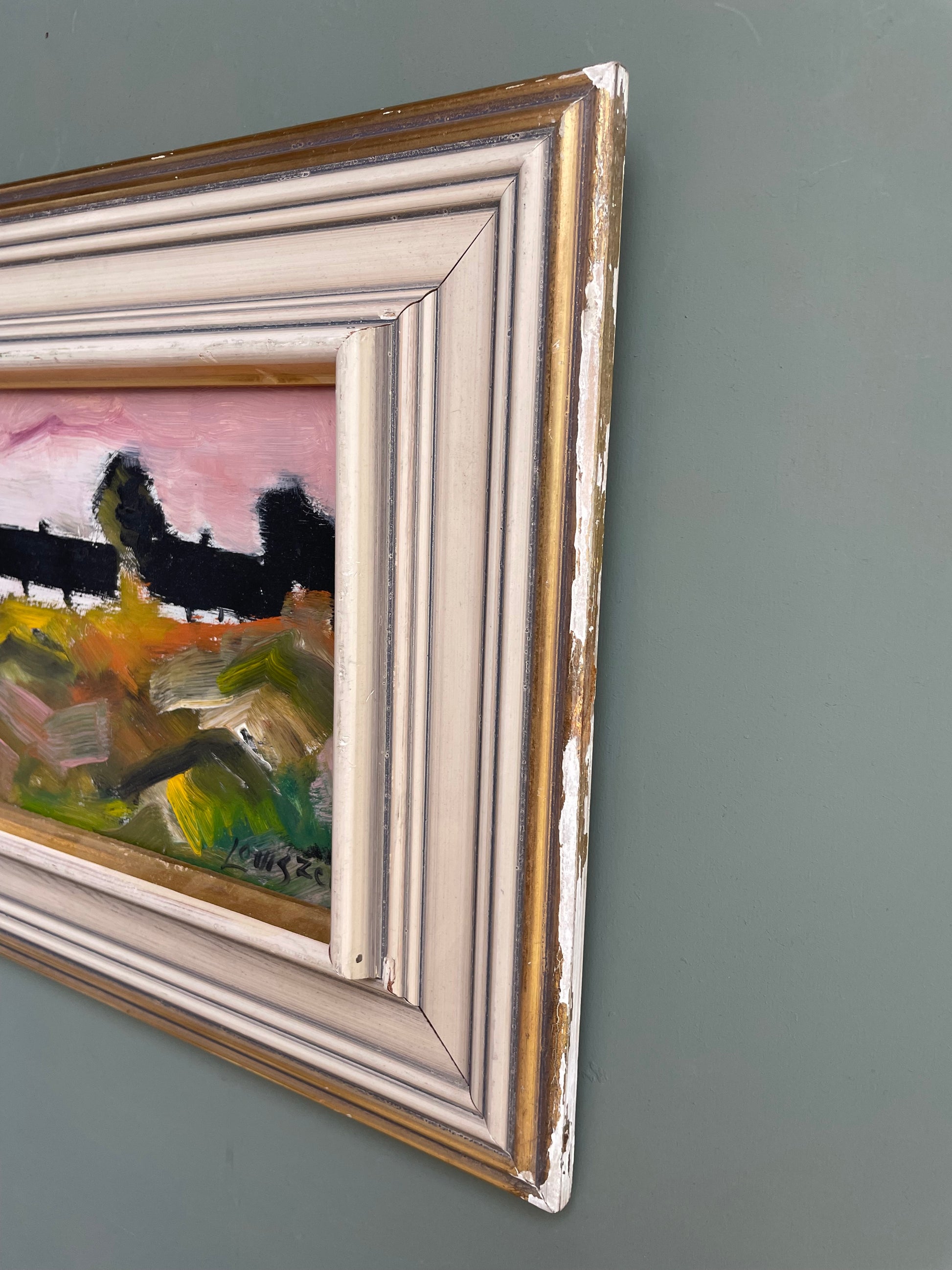 Condition: This painting is in great vintage condition. The frame has general chips and paint loss with one larger area of paint loss along the edge of the frame. These can be seen in the pictures.