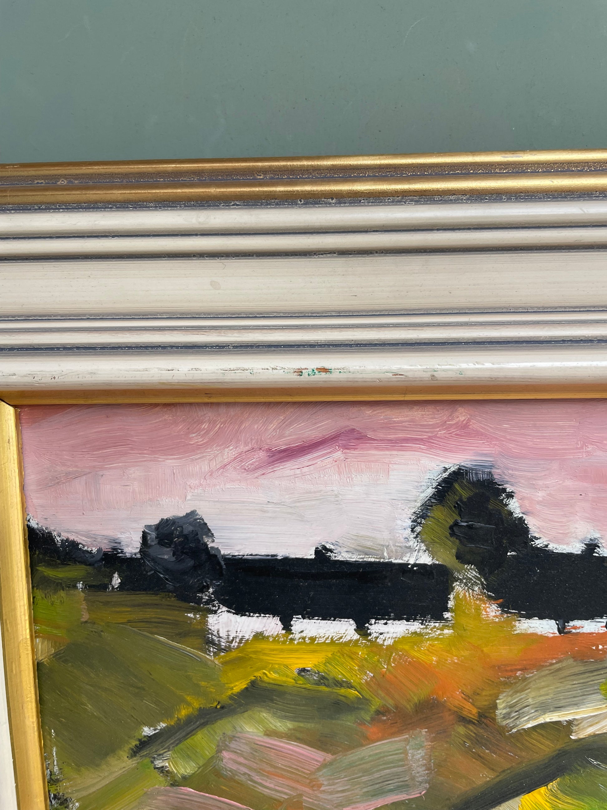 This lovely oil on board reminds us of the beauty of a remote island or the rugged wilderness of the highlands. This landscape painting features charming cottages and a stunning pink sky along with some gorgeous green notes. This would go perfectly with The Cottages I and III. This painting has a beautiful texture and warmth.