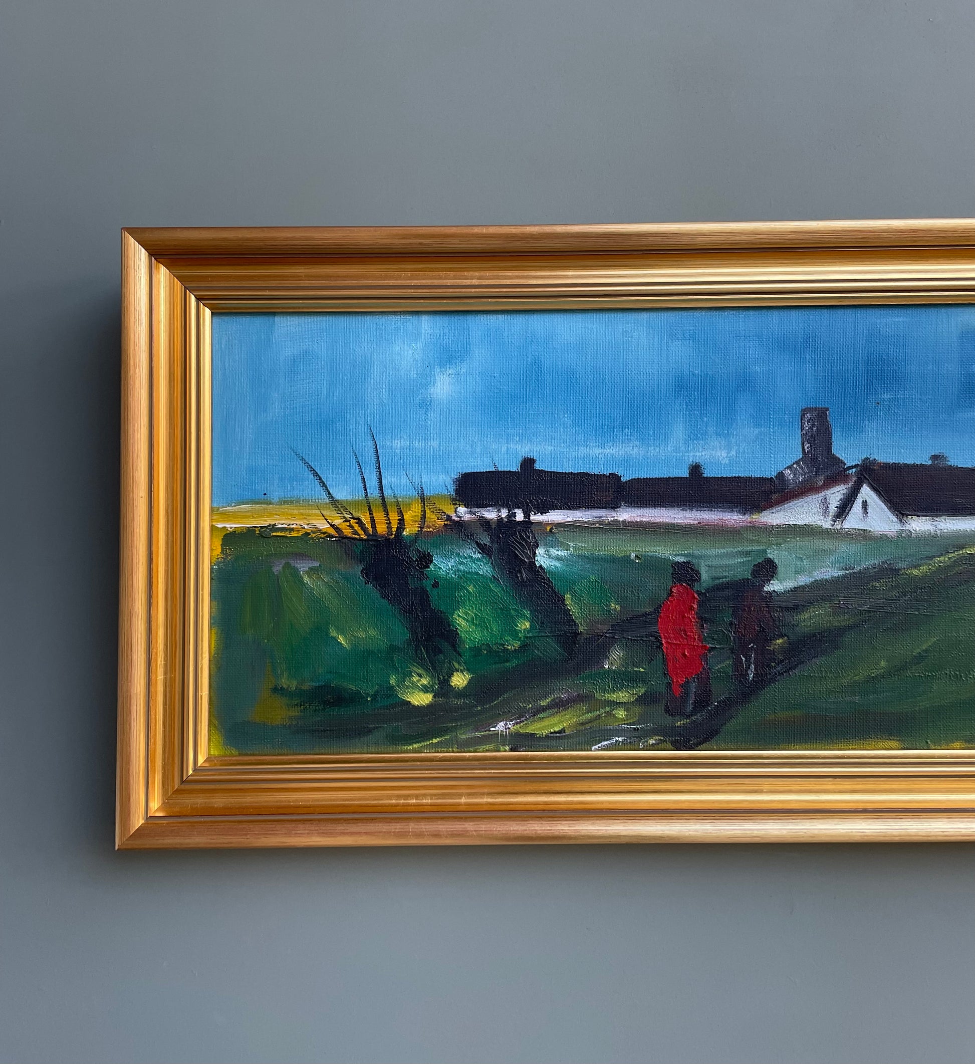 A bold and bright mid-century modern oil on canvas depicting two walkers. This painting really gives a sense of a crisp winters hike, and you can almost imagine the warm coffee waiting for the walkers when they arrive home. This oil on canvas is housed in a beautiful gold frame and would look right at home in a hallway, office or living room.