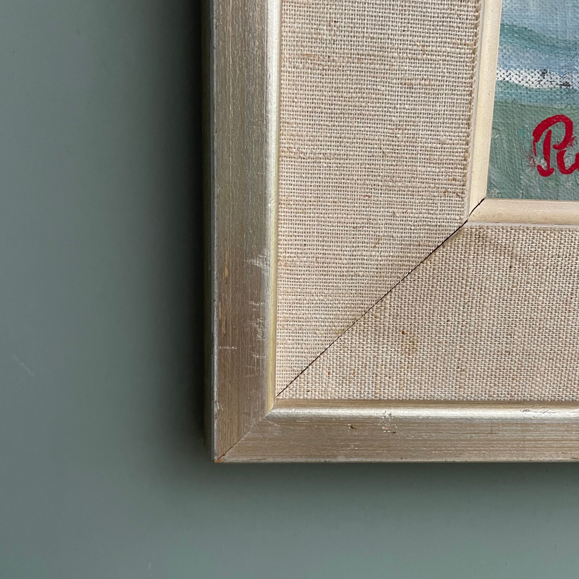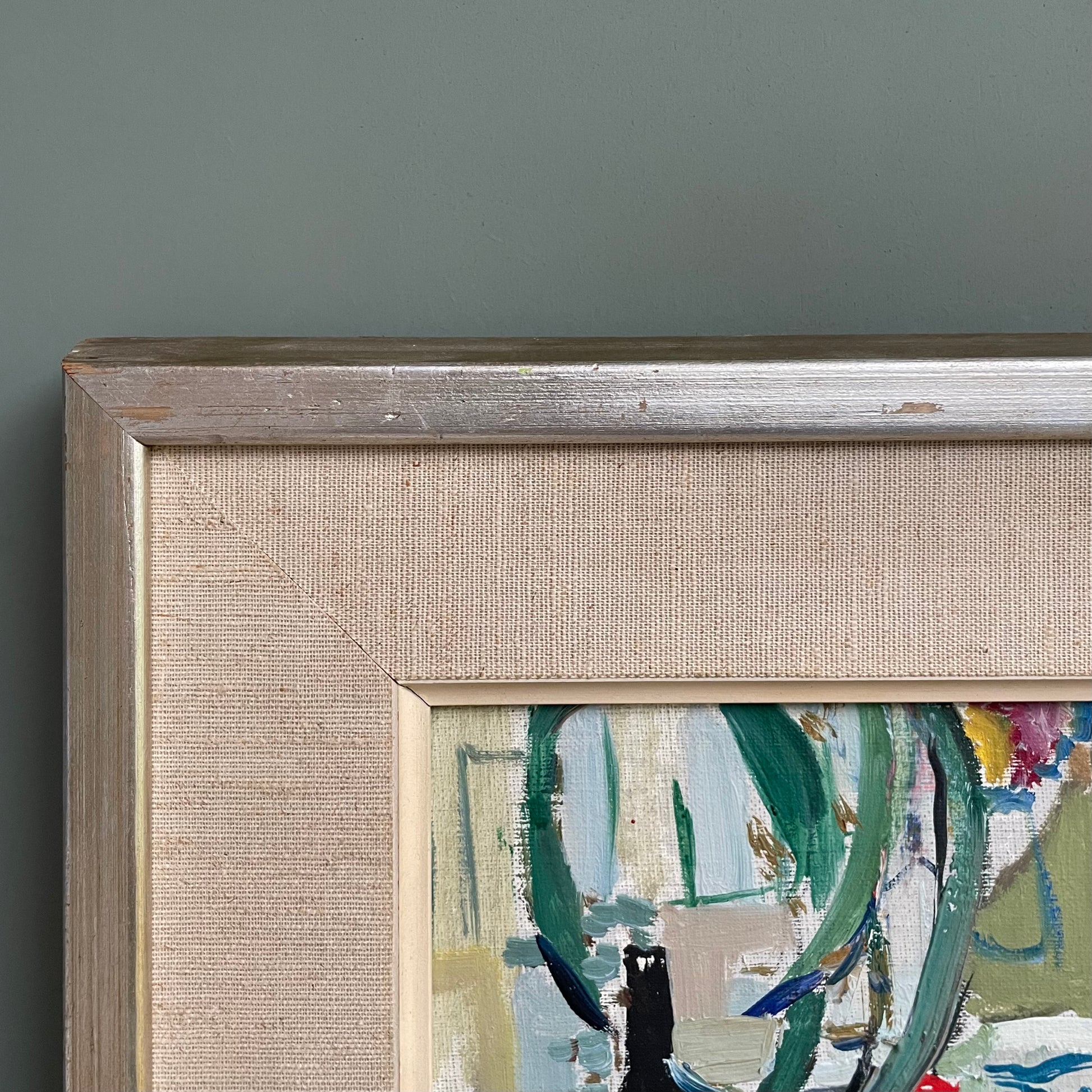 Condition: This painting is in great vintage condition. The wooden frame has a few chips and areas of paint loss, with some slight staining of the canvas.