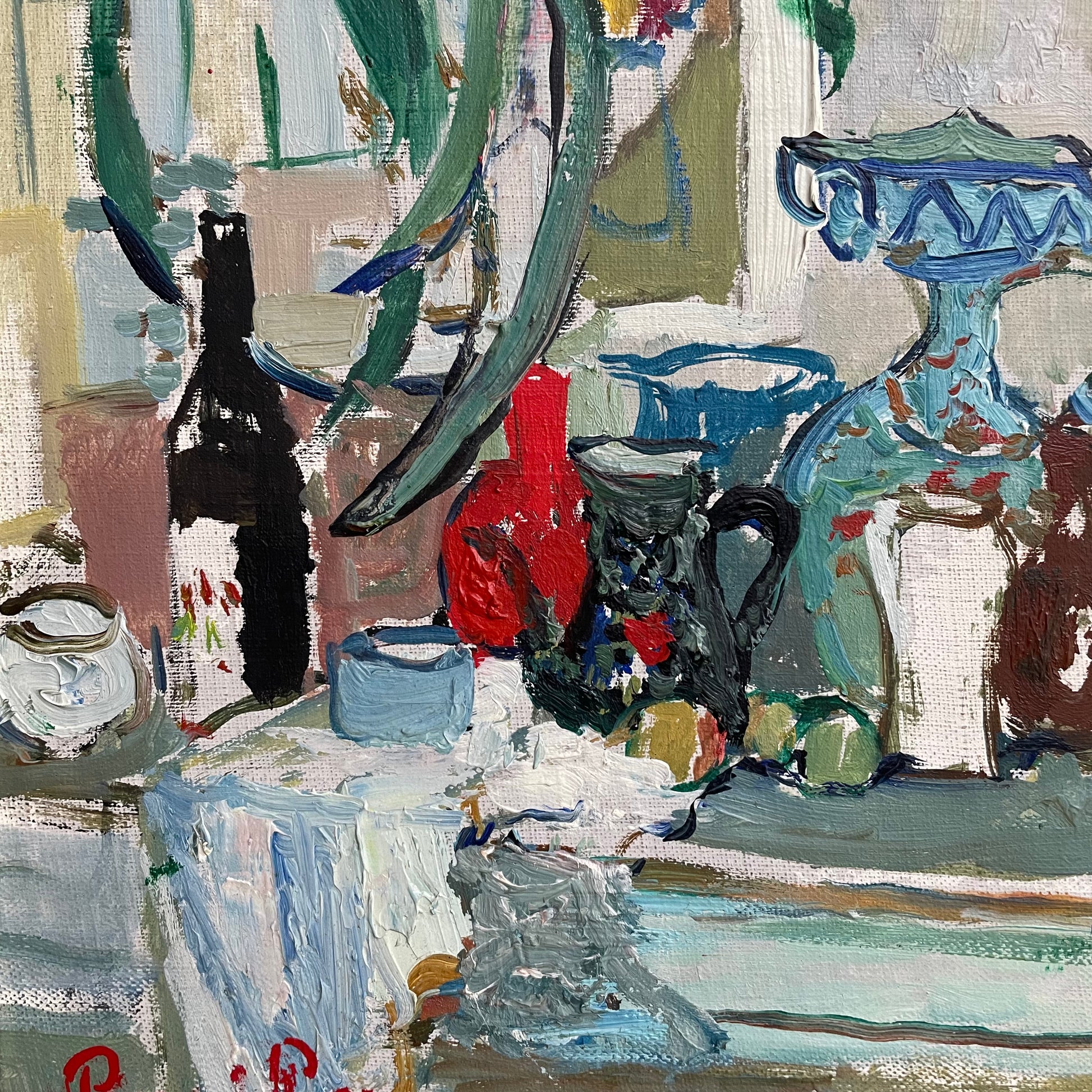 This mid-century still life painting of a table arranged with jugs, bowls, and wine is just lovely! Its expressionist style is distinct and informal creating a fun addition to your walls.