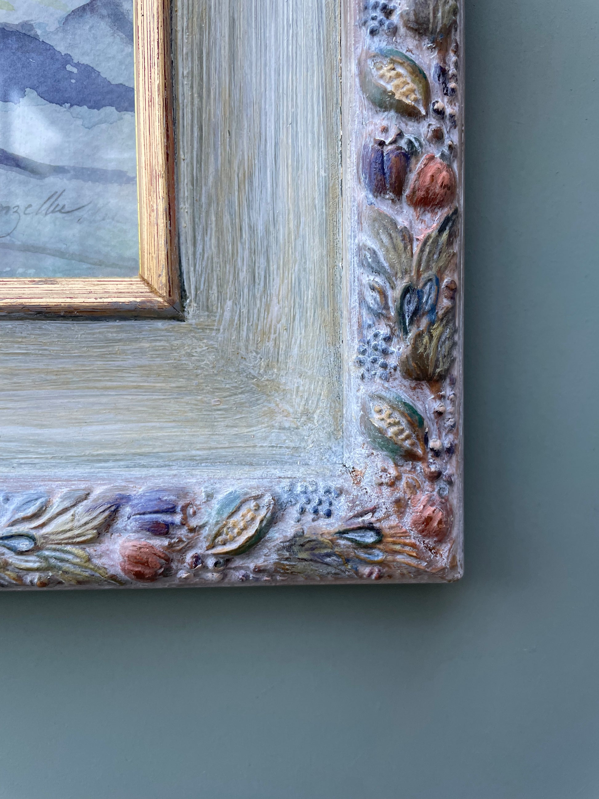 This stunning watercolour painting brings the beauty of tulips and orchids to life with a beautiful ornate frame that adds the perfect finishing touch. Blues and greens provide a tranquil backdrop, complemented by the subtle pink accents. A truly beautiful piece.